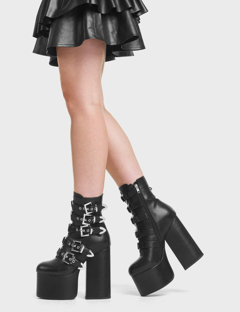 Secure Platform Platform Ankle Boots in Black. These Platform Ankle Boots feature a Silver buckles and straps with a Silver Heart. Made with eco-friendly materials and 100% cruelty-free.